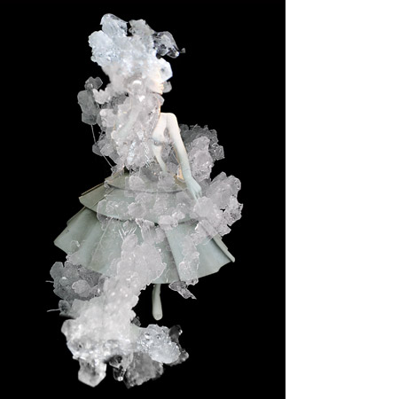 / numerous personal experiments of crystal growth are underlying the dissolving model figures, which appear sometimes like exotic plants or evaporate in snow- and cloudlike structures - on their way of aspiring to other formations of existence. /