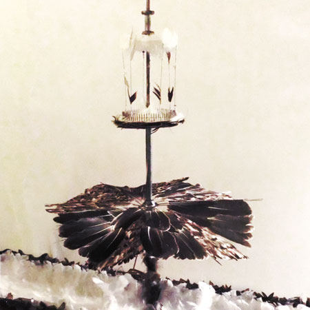 wood, plaster, sea bird feathers, broken glass, laquer, pigment
